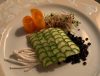 den Saibling mit der Filet-Oberseite auf Zucchini-Schuppen legen. Dann die Klarsichtfolie satt um die Fischfilets verschließen (dicht).